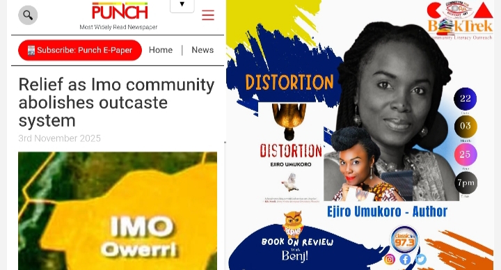 “I wrote ‘Distortion’ to shed light on the stories of women and men who suffered from this outdated and inhuman practice,” Lady Ejiro said in an interview. “One of the characters in the book, Nneka, was based on the true-life story of a young woman from the East. I captured her story and more in several scenes and plots in my book DISTORTION to call attention to it in the most dramatic way possible. I’m thrilled to see that our efforts have paid off, and a community in Imo State has taken the bold step to abolish the Osu caste system.”