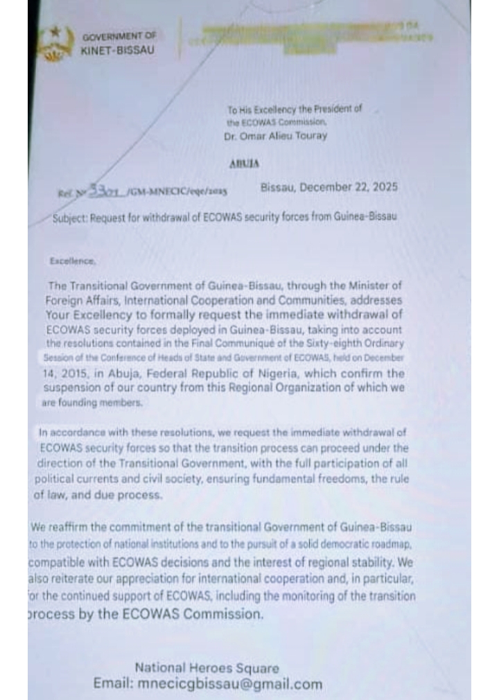 In a formal letter to ECOWAS Commission President Dr. Omar Touray, Gen. Horta Inta-A’s administration cited the need for a smooth transition, stating that the withdrawal would enable the Transitional Government to take full control, with the participation of all stakeholders, and uphold fundamental freedoms, the rule of law, and due process.
