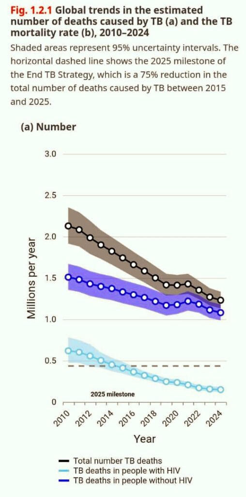 A Graph from WHO showing the reduction in total deaths caused by TB between 2015 and 2025