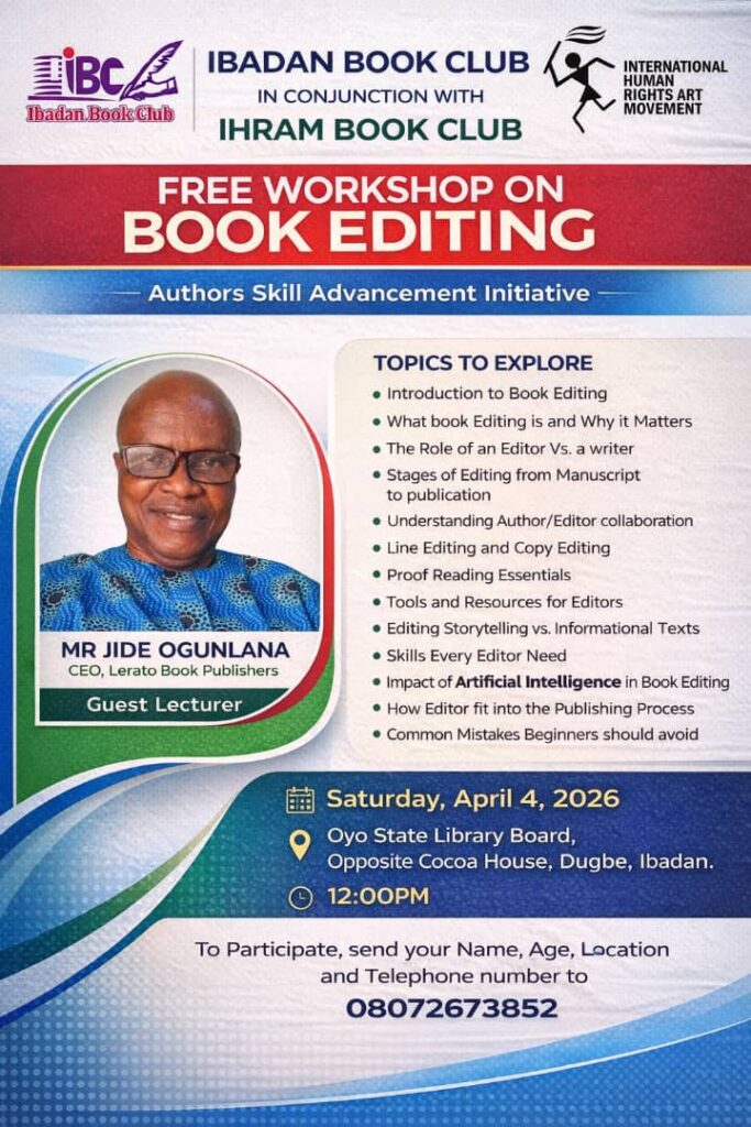 In an era where the literary landscape evolves at breakneck speed, the Ibadan Book Club is stepping up to equip writers with essential tools for success. On Saturday, April 4, 2026, the Club will host a free one-day workshop on Book Editing, offering practical training to help writers refine their manuscripts and navigate the competitive publishing industry. The event, set to take place at 12:00 PM in the Board Room of the Oyo State Library Board, opposite the iconic Cocoa House in Dugbe, Ibadan, underscores the Club’s commitment to fostering literary excellence and empowering creatives.